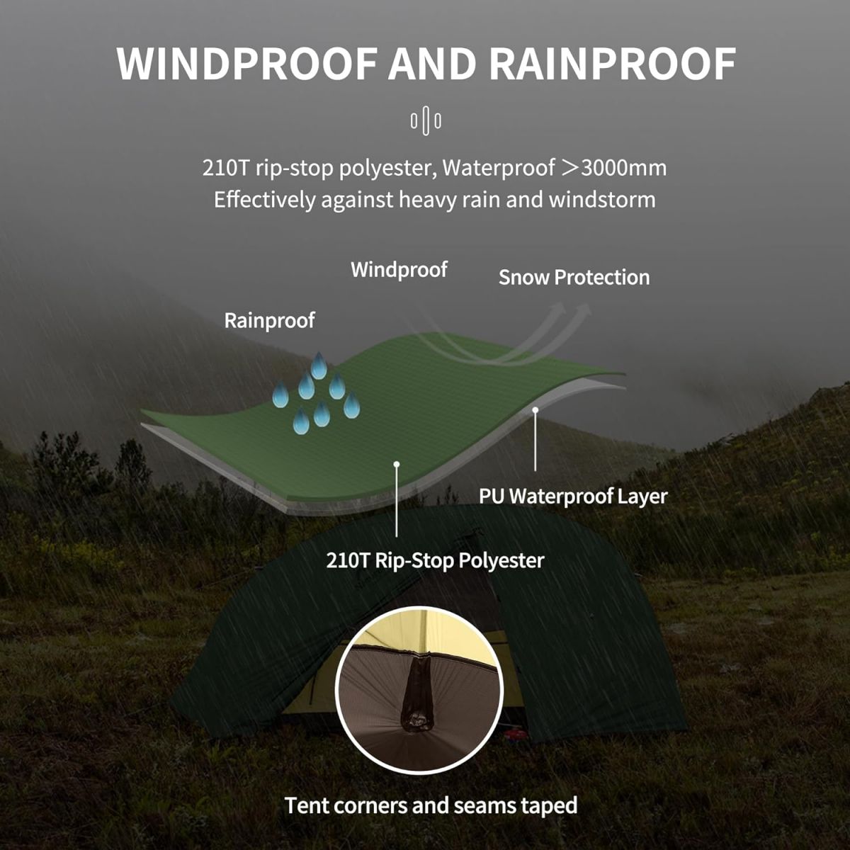 • El sobre techo está elaborado con poliéster antidesgarro 210T y revestimiento de poliuretano (PU) con índice de impermeabilidad de PU3000mm. Asimismo, el sobre techo cuenta con una ventana de ventilación. Finalmente, tiene puntos fijos para los vientos.