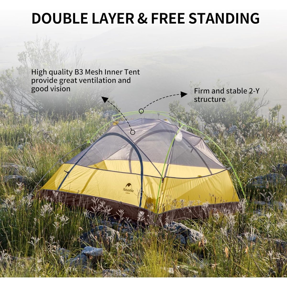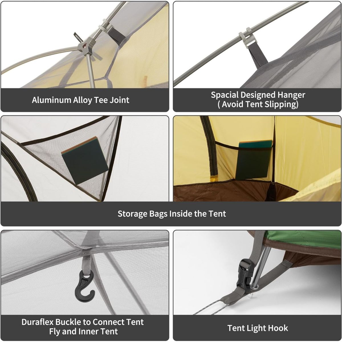 En busca de un peso ligero y mayor rendimiento del producto, esta carpa utiliza tela poliéster antidesgarro 210T, resistente al agua, con malla transpirable y varillas de aluminio 7001. Esta carpa es a prueba de viento, impermeable, transpirable y a prueba de insectos, lo que garantiza tu comodidad y segura a la hora de acampar.