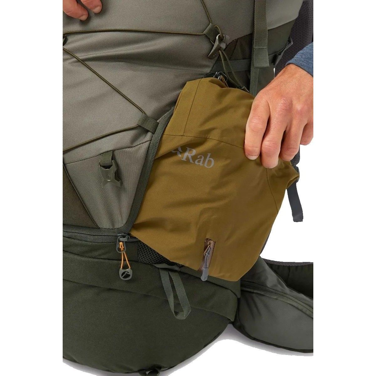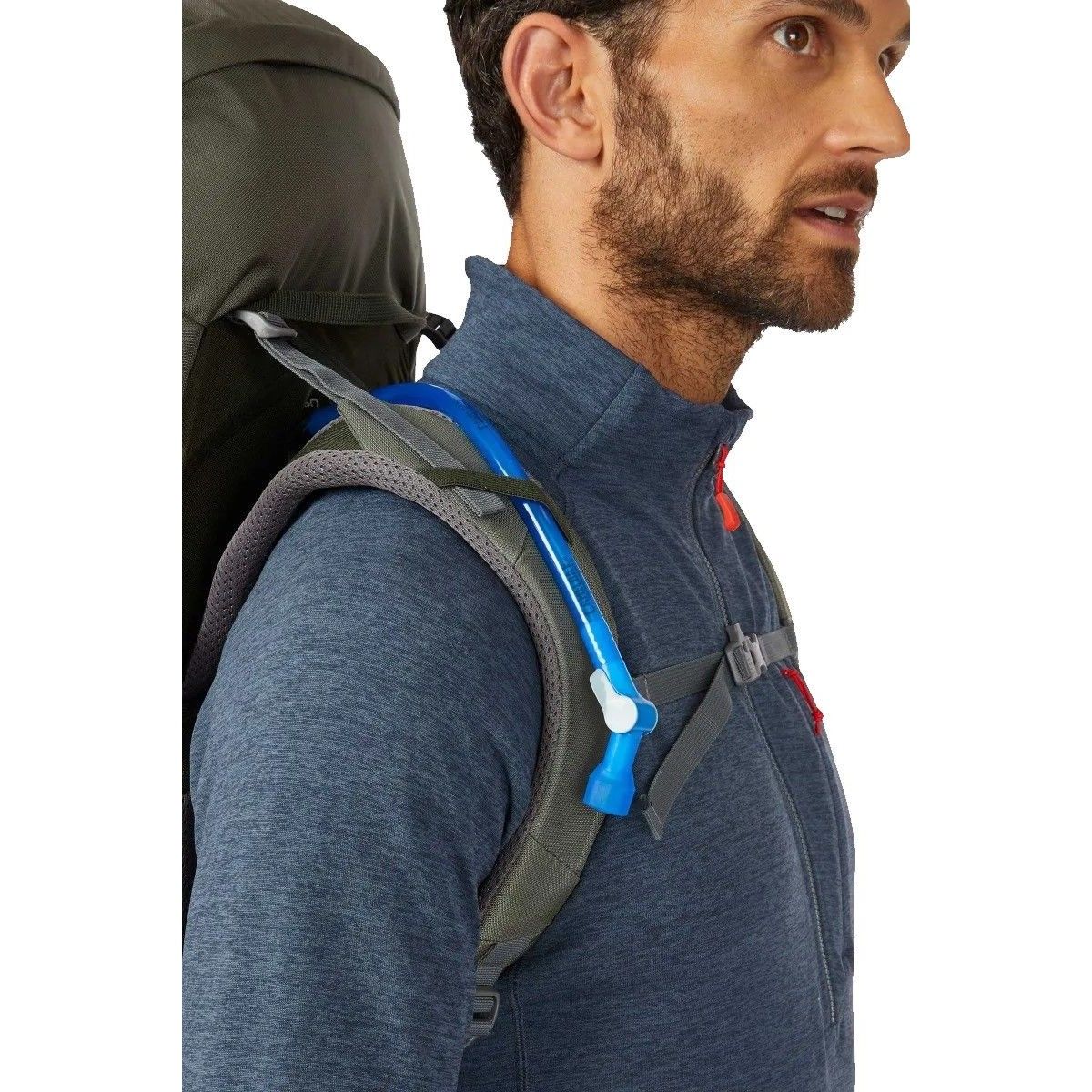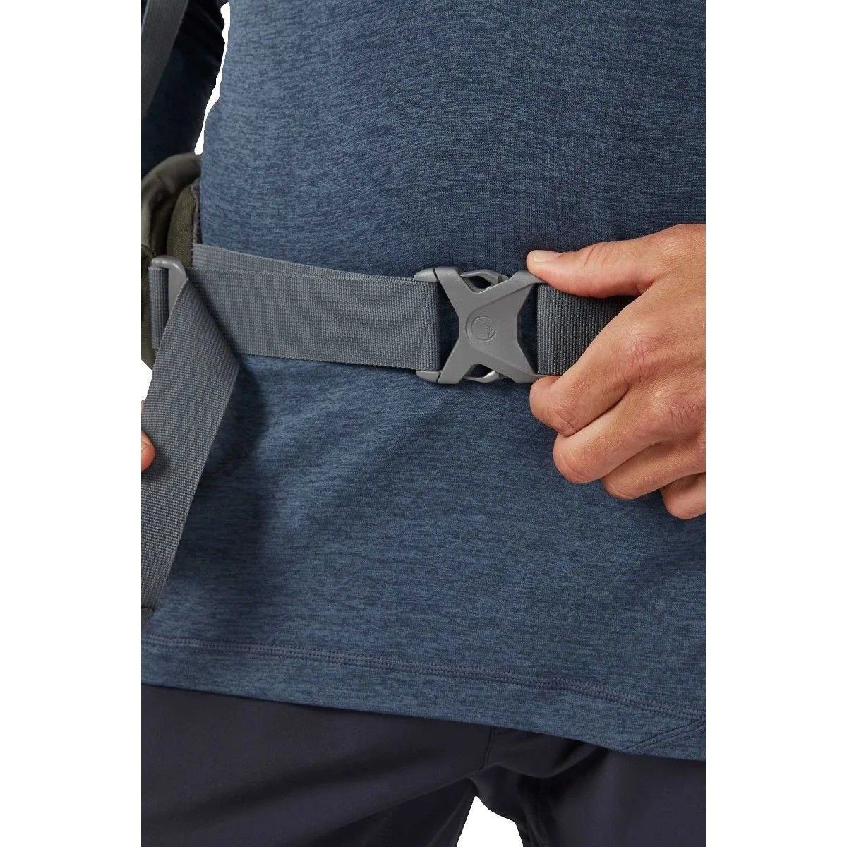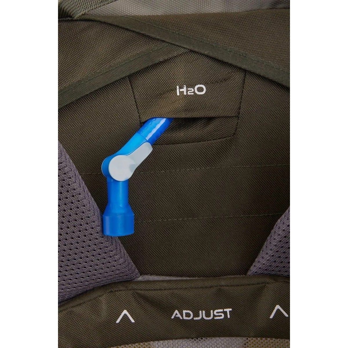 La mochila ofrece un fácil acceso a todo tu equipo gracias a su cierre frontal y a su entrada inferior, con un panel divisor interno para mantenerlo todo organizado. El cinturón acolchado de la cadera tiene bolsillos de acceso fácil que son perfectos para guardar aperitivos o una brújula a mano, mientras que el elástico frontal es el lugar ideal para guardar tu equipo húmedo. En los viajes largos te vendrá bien la compresión en la base y en los laterales, que puedes ajustar para asegurar la mochila a medida que disminuyen las provisiones. Es compatible con una bolsa de agua de 3 litros, lo que te permite mantenerte hidratado sobre la marcha, y cuenta con una cubierta desmontable para la lluvia que se puede colocar rapidamente.