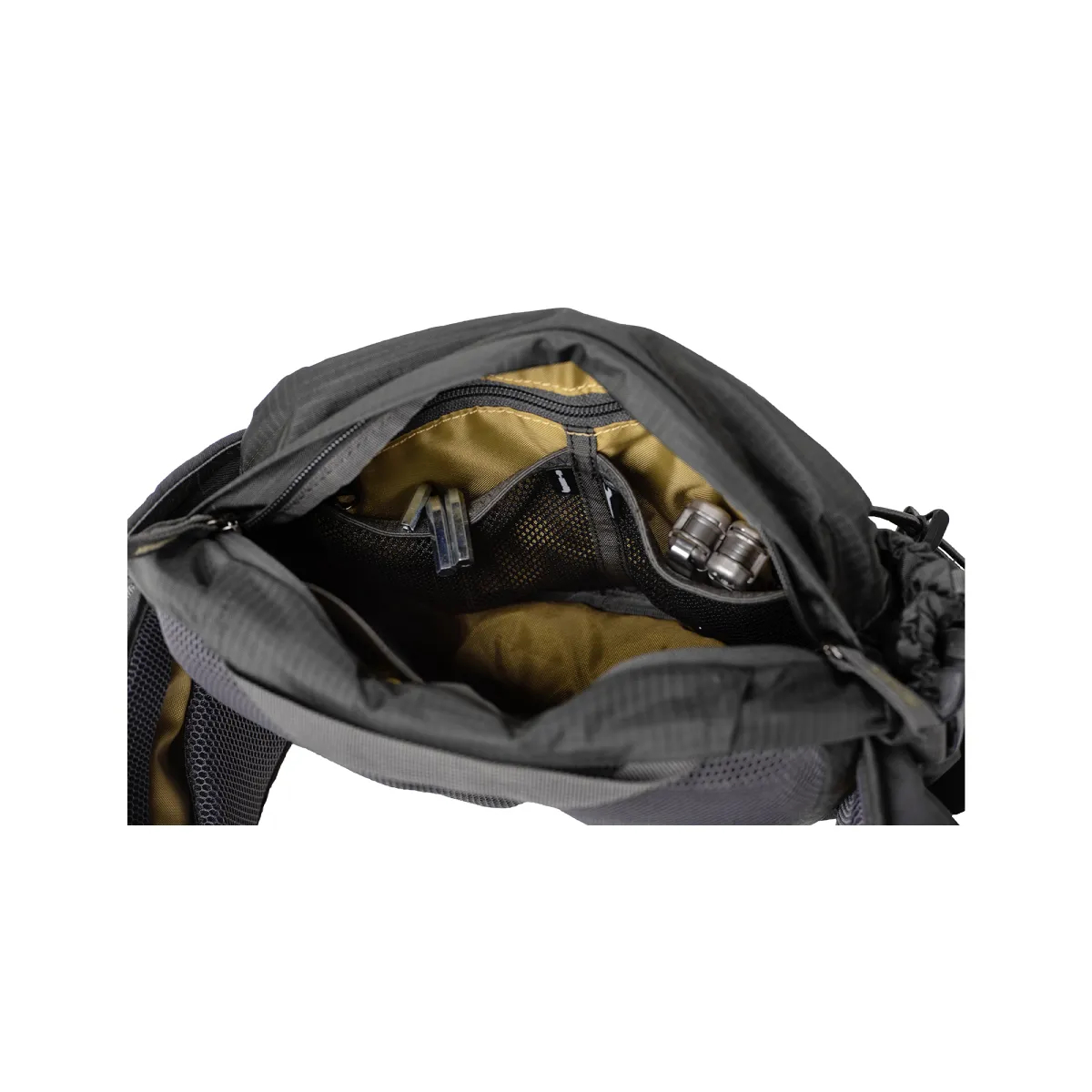 • Bolsillo elástico para botella y bolsillo con cierre en la cintura
