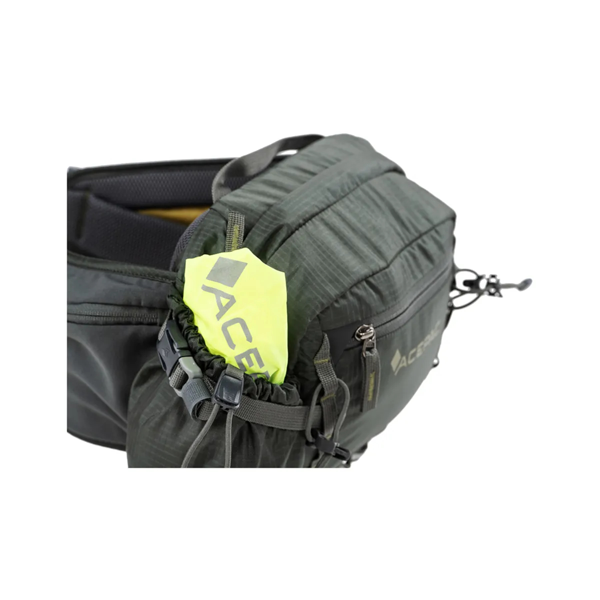 • Bolsillo para botella en la correa de cintura y bolsillo lateral para impermeable