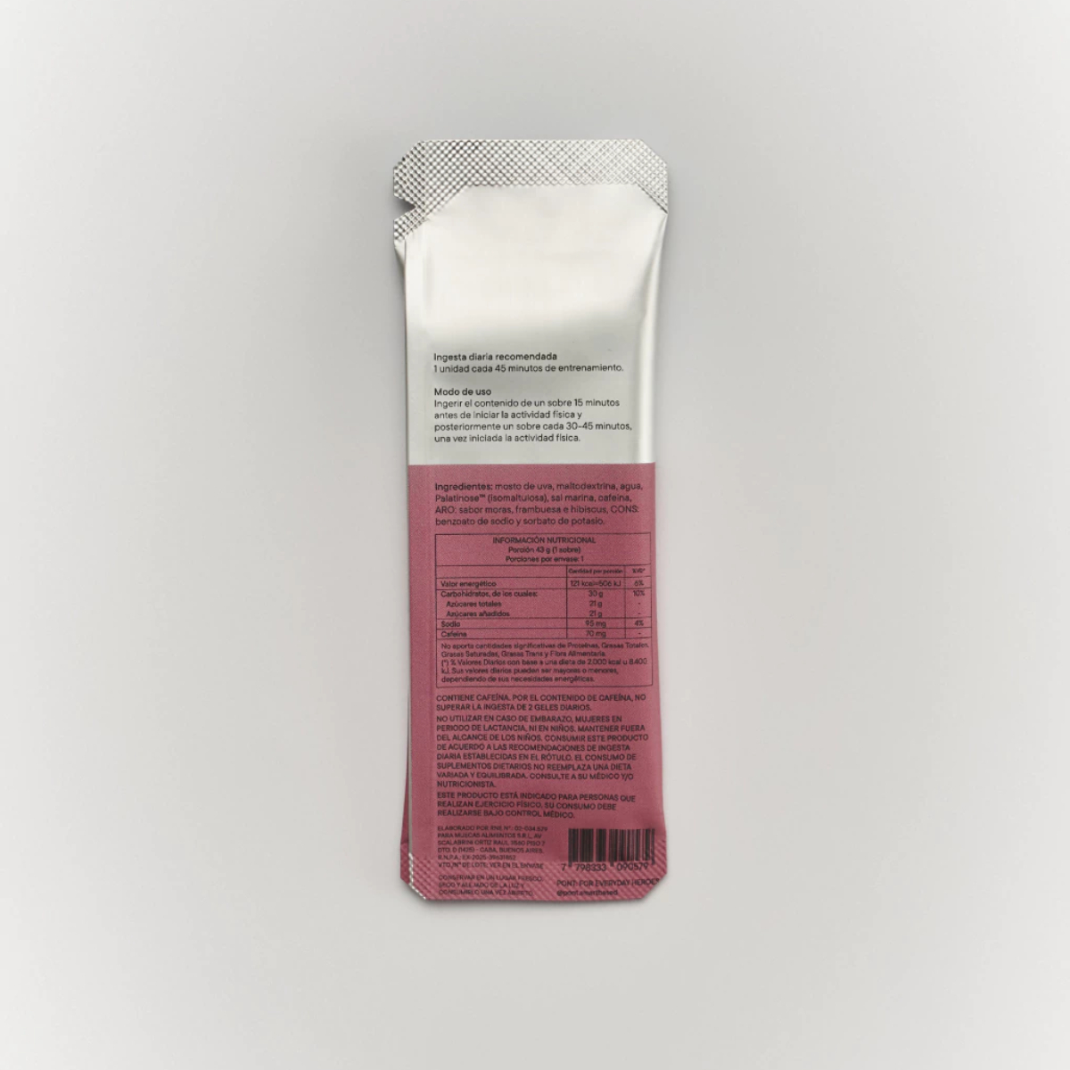 Mosto de uva blanca | Maltodextrina | Agua | Palatinose™ (isomaltulosa) | Cafeína | ARO: Sabor moras, frambuesa e hibiscus | CONS: benzoato de sodio y sorbato de potasio