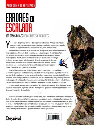 Errar es humano. Pero cuando practicas un deporte de riesgo, errar es algo más, es jugarte tu seguridad y la de tus compañeros. Por eso este manual, que se llama así "Errores en escalada", se va a convertir pronto en el mejor aliado de los escaladores, sea cual sea la disciplina que practiquen. Joaquín Colorado ha puesto sus 30 años de experiencia como docente y como profresional de la escalada en este manual, y nos propone 101 experiencias, 101 errores vividos o estudiados por él. Y lo mejor, combina lo didáctico con lo narrativo para crear una historia "ejemplar" a partir de la cual analizar el error y proponer soluciones. Fácil de leer, fácil de comprender, entretenido y práctico. Un manual que nos enganchará desde el primer "error".