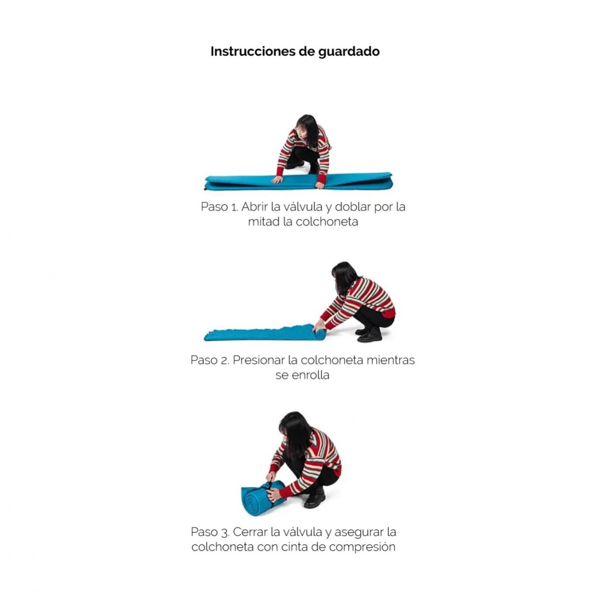 Es muuy grande. Muy cómoda y fácil de usar. Prácticamente no hace falta inflarla para usarla. Es muy acolchonada y no es tan pesada como pensaba. Con un aislante debajo es la convinación perfecta.
